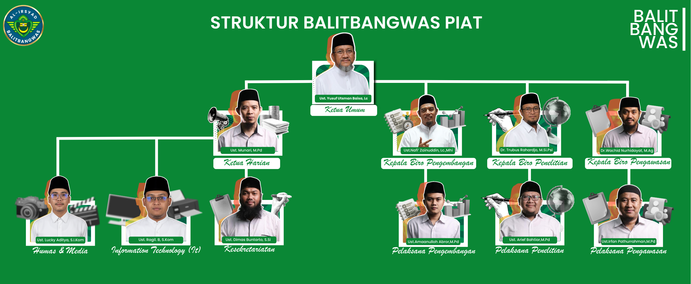 Balitbangwas PIAT dipimpin oleh seorang Ketua. Adapun, untuk mencapai visi, misi serta tujuan Balitbangwas PIAT, maka dibentuk 4 (empat) biro.